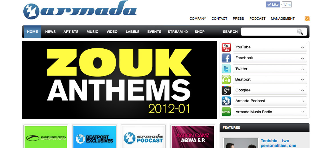 Maykel Piron, managing director Armada Music: “The online world has changed a lot within a very short time, making me think about only featuring our contact info and link to our YouTube channel on the website. I was fed up with it. 99 % of the current websites have too much of a 90′s feel. Dancefoundation advised us to launch a website in which the well known social networking sites and YouTube are integrated. I’m very pleased with the result.”