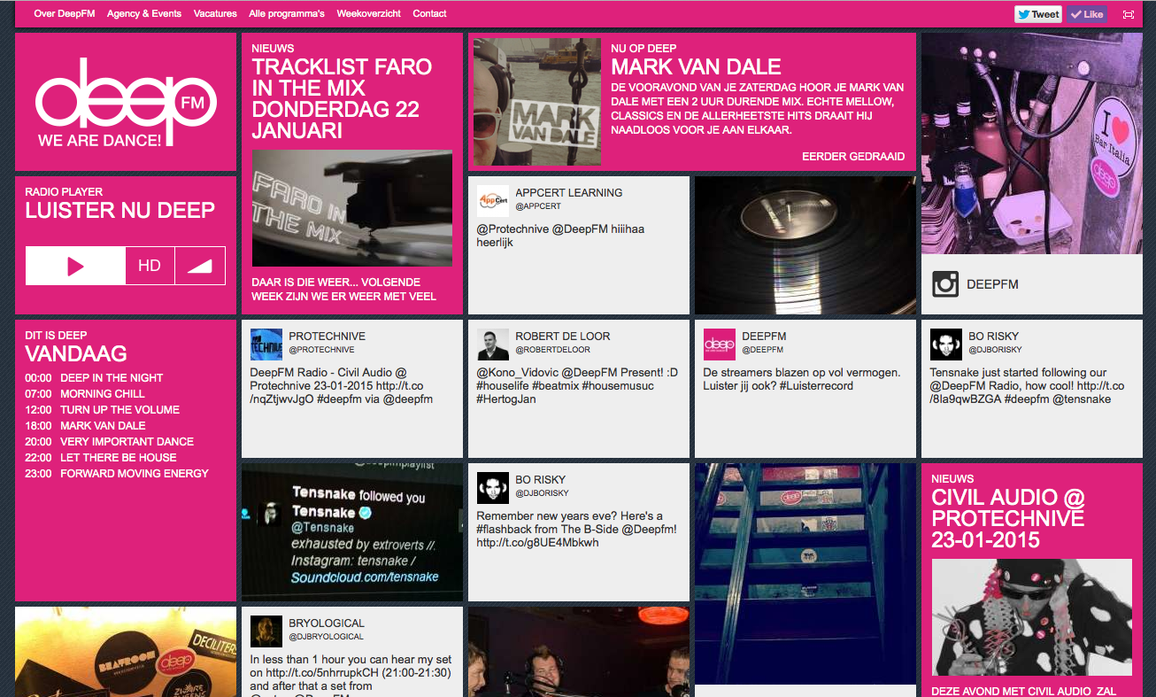 For over a decade, DeepFM is one of the leading digital radio stations in The Netherlands, broadcasting a wide variety of dance music. The station started 2015 with the launch of a new, social wall driven website.